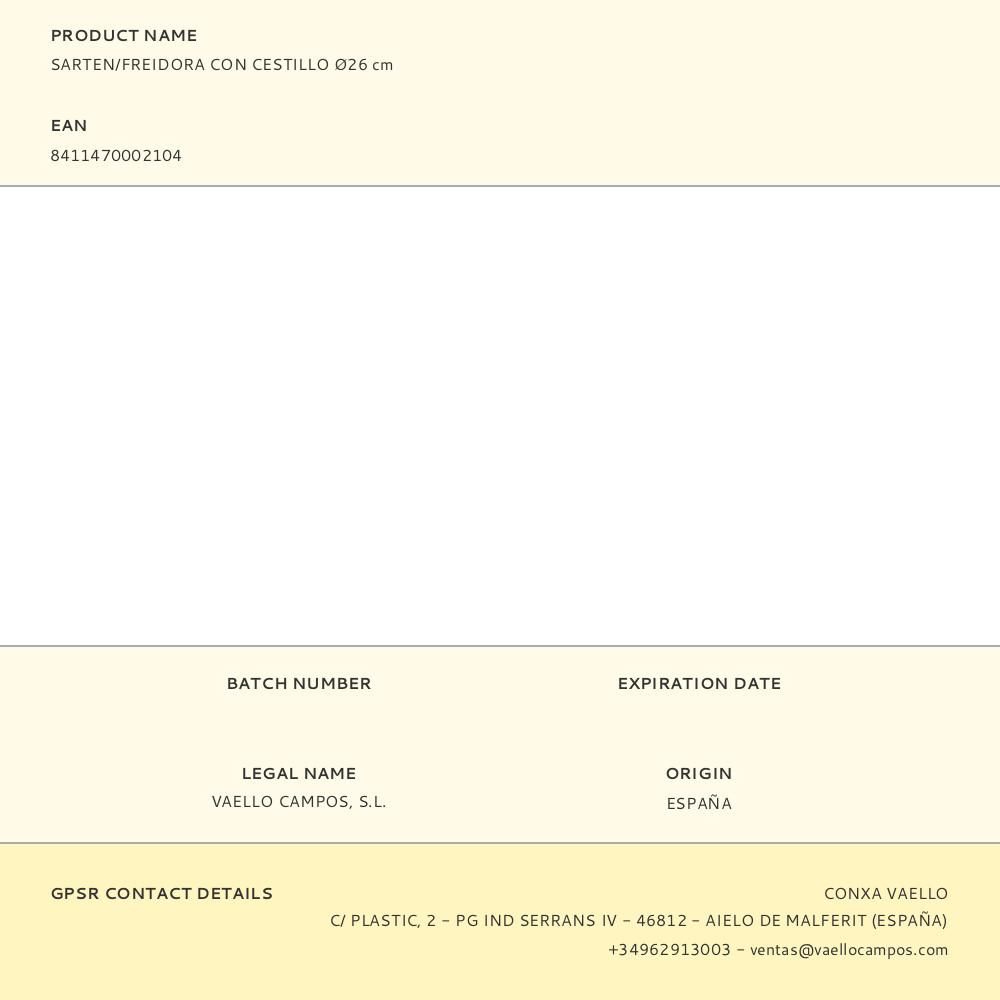 SARTÉN/FREIDORA CON CESTILLO Ø26cm. PRODUCTO FABRICADO EN ACERO LAMINADO EN FRÍO Y RECUBIERTO CON UNA CAPA DE ESMALTE ANTIÁCIDO. LLEVA INCORPORADO UN CESTILLO CON EL QUE ESCURRIR EL ACEITE.APTA PARA FUEGO EN LLAMA Y HORNO. VAELLO