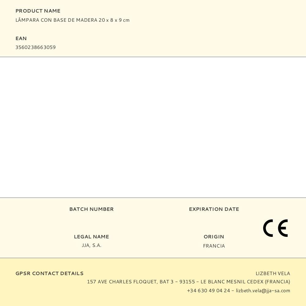 LÁMPARA CON BASE DE MADERA 20x8x9cm CON INTERRUPTOR DE ENCENDIDO Y APAGADO. CABLE DE 1,5m. 220-240V, 50Hz, 40W, E27.