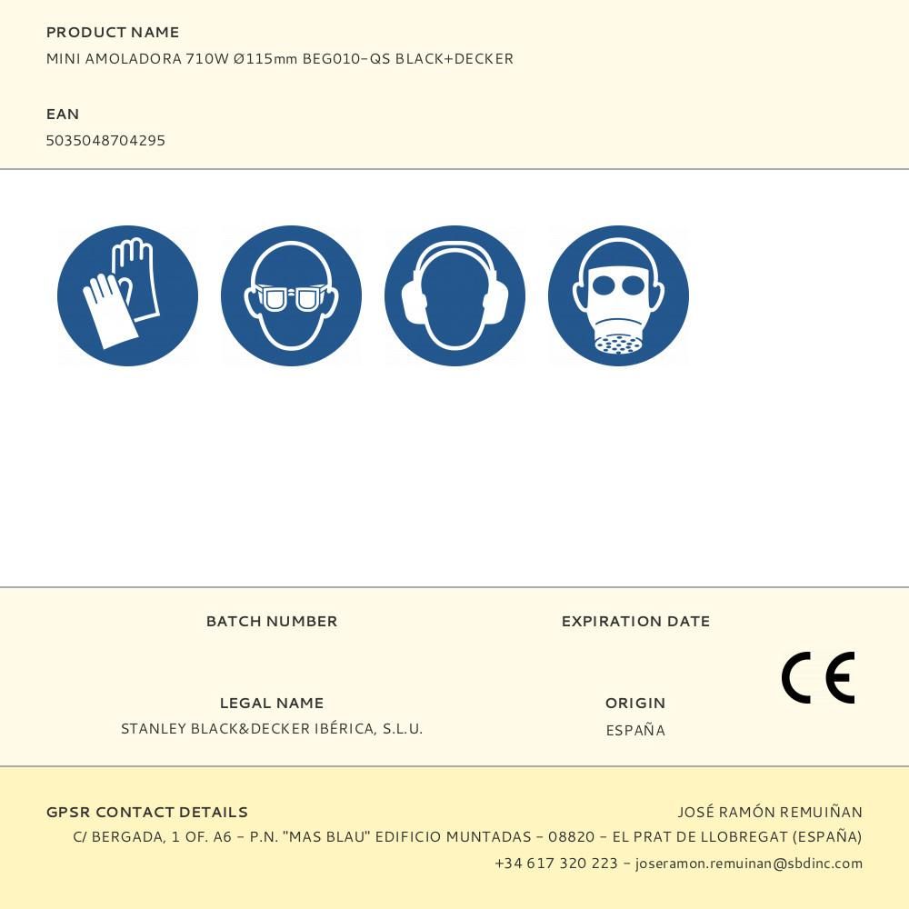 MINI AMOLADORA. POTENCIA: 710W. DISCO: Ø115mm. BEG010-QS BLACK+DECKER. VELOCIDAD: 12.000rpm. TAMAÑO DEL EJE: M14, PROTECCIÓN CONTRA REARRANQUE Y ARRANQUE SUAVE. CABLE DE 2m. EMPUÑADURA LATERAL. 89dB 230V