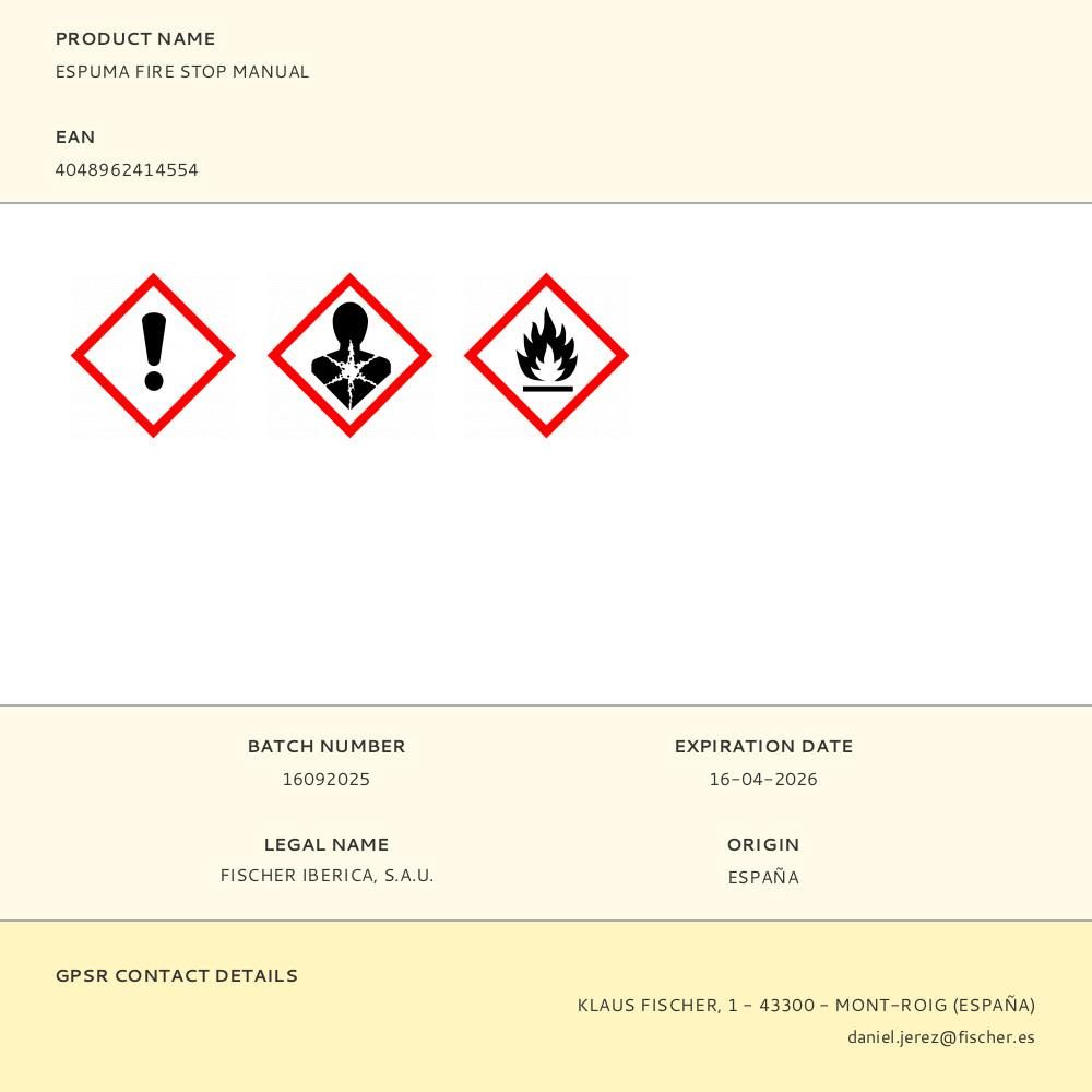 ESPUMA FIRE STOP MANUAL. ESPUMA DE POLIURETANO MONOCOMPONENTE QUE ENDURECE GRACIAS A LA HUMEDAD DEL AIRE. INFLAMABILIDAD TIPO B1 Y RESISTENCIA AL FUEGO HASTA EI240 PARA JUNTAS LINEALES, BAJO LAS CONDICIONES DE LOS INFORMES CORRESPONDIENTES