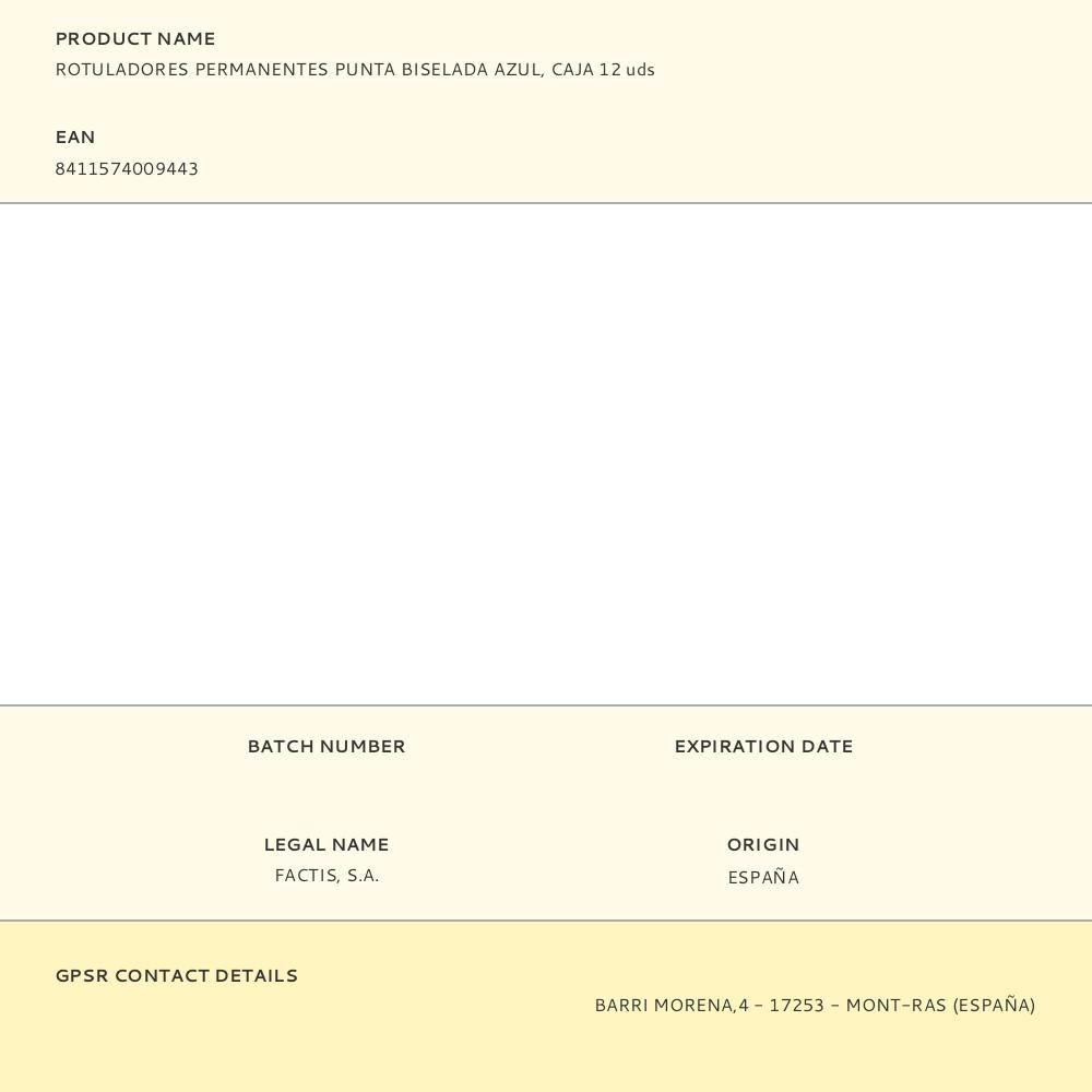 CAJA CON 12 ROTULADORES PERMANENTES. PUNTA BISELADA AZUL MILAN. ROTULADORES PERMANENTES COLOR AZUL MARINO. ROTULADOR PERMANENTE SOBRE LA MAYORÍA DE MATERIALES. TINTA A BASE DE ALCOHOL. PUNTA BISELADA 1 - 4mm. RECOMENDAMOS TAPAR DESPUÉS DE USAR Y ALMACENAR EN POSICIÓN HORIZONTAL.