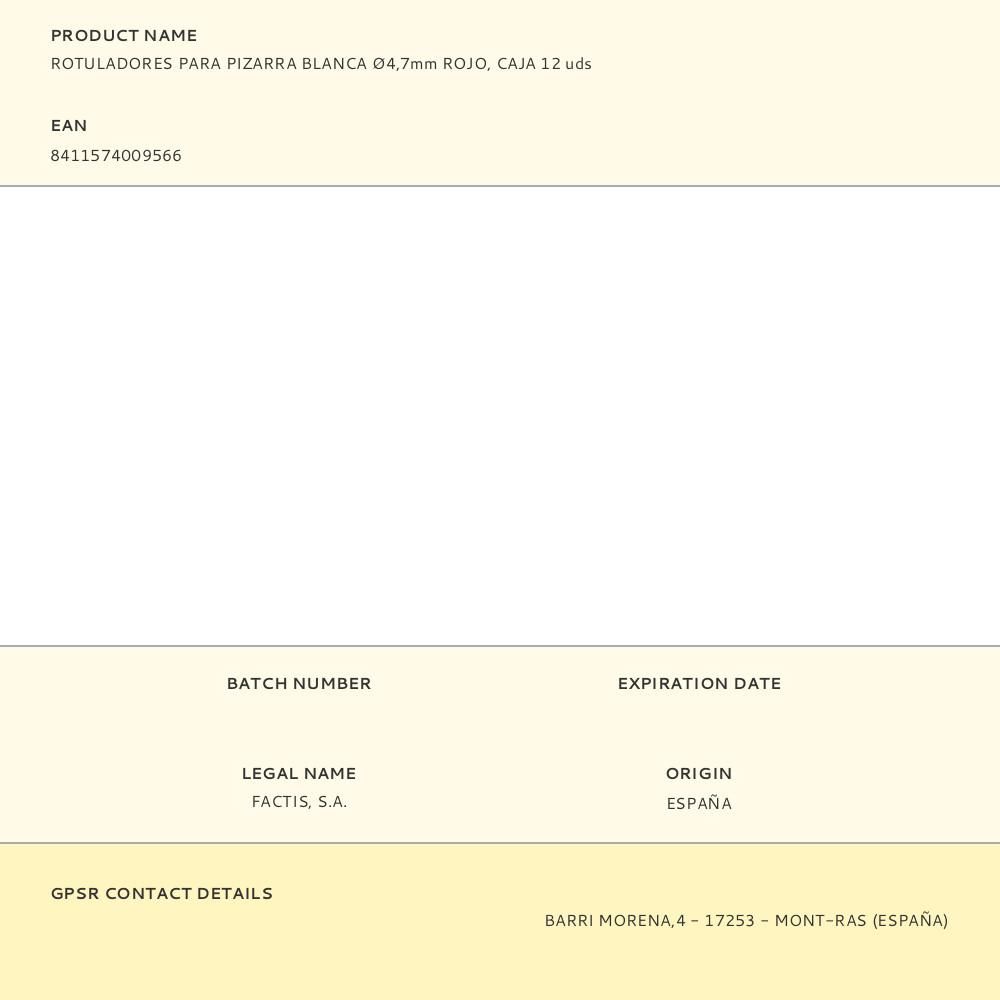 CAJA DE 12 ROTULADORES ROJOS PARA PIZARRA BLANCA MILAN. ROTULADORES PARA PIZARRA BLANCA, COLOR ROJO. BORRABLE EN SECO. TINTA A BASE DE ALCOHOL. PUNTA REDONDA Ø4,7mm. RECOMENDAMOS TAPAR DESPUÉS DE USAR Y ALMACENAR EN POSICIÓN HORIZONTAL. ROTULADORES DE RECAMBIO PARA EL BORRADOR MAGNÉTICO REF: 16529123