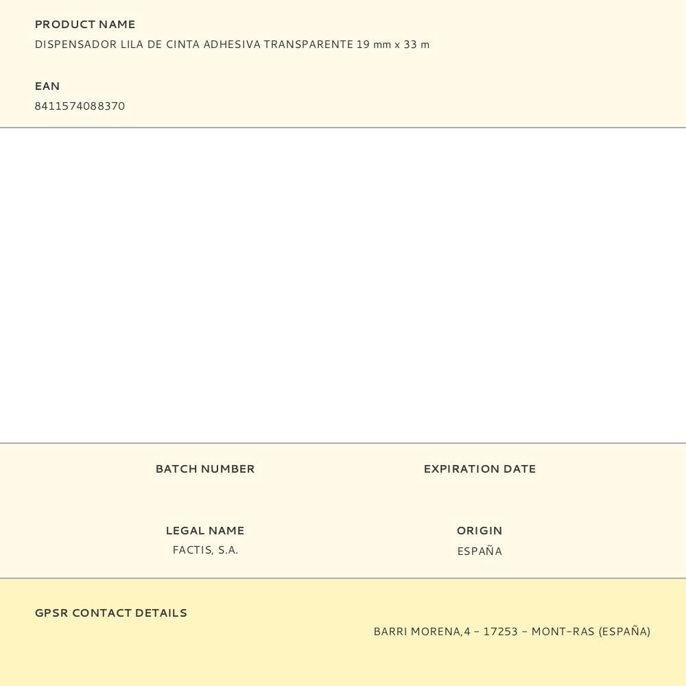 BLÍSTER CINTA ADHESIVA 19mm x 33m CON DISPENSADOR RECARGABLE COLOR LILA. CINTA TRANSPARENTE DE TONO LIGERAMENTE AMARILLO, ACABADO BRILLANTE. CON HOJA DE CORTE METÁLICA. MILAN