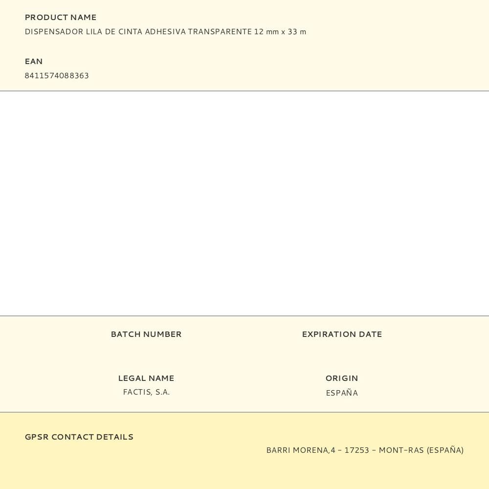 BLÍSTER CINTA ADHESIVA 12mm x 33m CON DISPENSADOR RECARGABLE COLOR LILA. CINTA TRANSPARENTE DE TONO LIGERAMENTE AMARILLO, ACABADO BRILLANTE. CON HOJA DE CORTE METÁLICA. MILAN