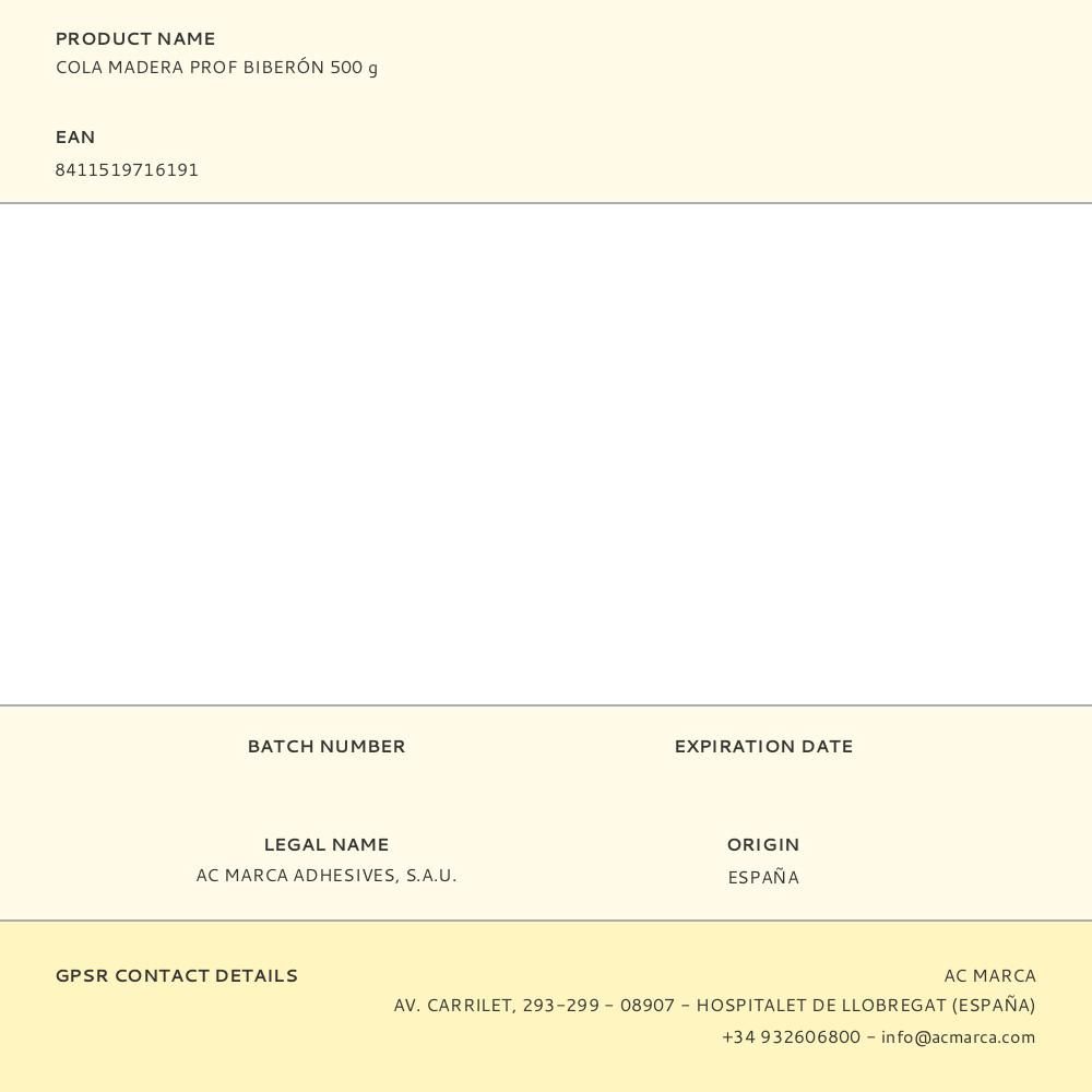 COLA MADERA PROF BIBERÓN 500 g. COLA ESPECIAL PARA EL ENCOLADO DE TODO TIPO DE MADERAS Y DERIVADOS TRABAJOS DE MONTAJE, ENSAMBLAJE, REVESTIMIENTOS Y BRICOLAJE MÁS FUERTE QUE LA MADERA PERMITE RECTIFICAR UNIONES FLEXIBLES.