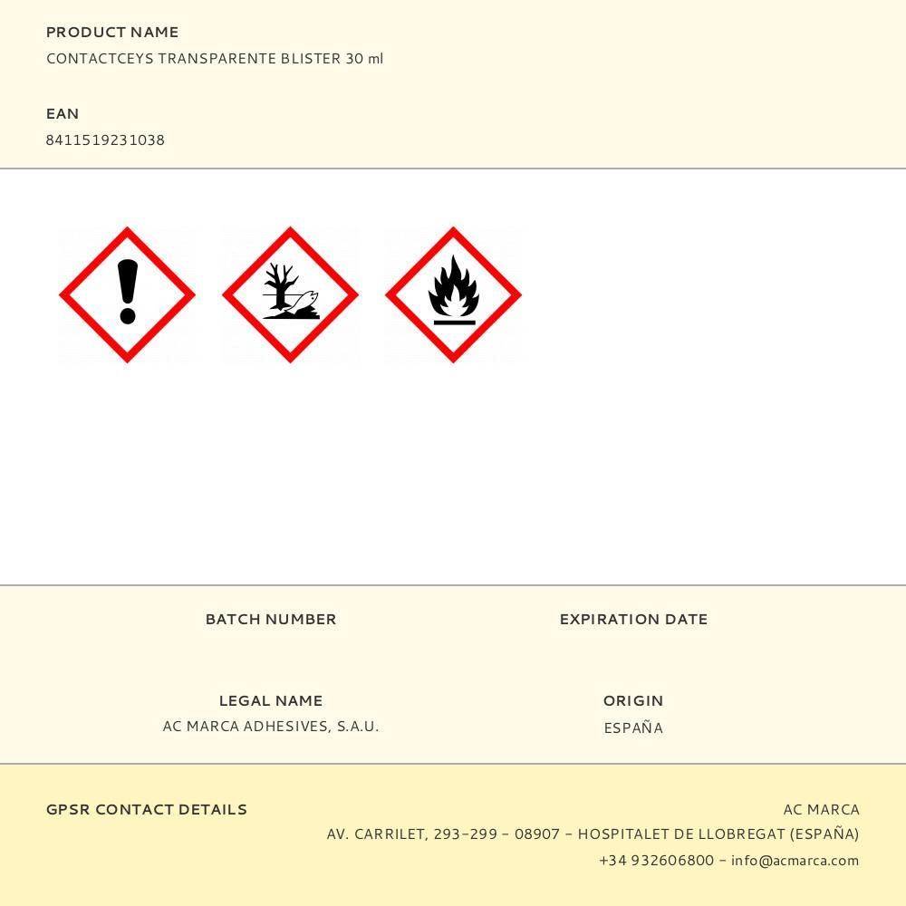 CONTACTCEYS TRANSPARENTE BLISTER 30 ml. COLA DE CONTACTO EN BASE NEOPRENO, MUY POLIVALENTE Y DE USO GENERAL PARA UNIR MULTITUD DE MATERIALES. PROPORCIONA UNIONES RESISTENTES, FLEXIBLES Y DURADERAS. EN ESPECIAL PROPORCIONA INMEJORABLES RESULTADOS PARA PEGAR CUERO, PIEL, MADERA, GOMA, CAUCHO, ETC.