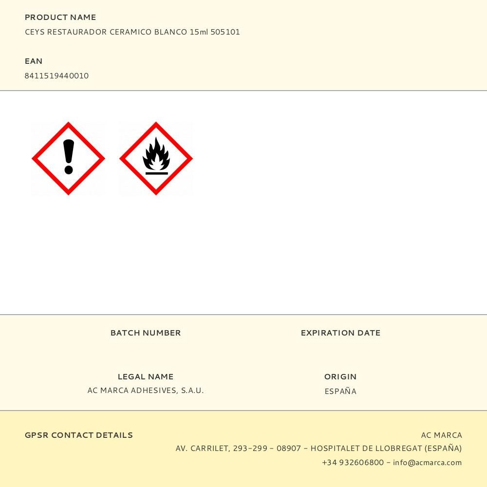CEYS RESTAURADOR CERAMICO BLANCO 15ml 505101 REPARA DESCONCHADOS, GOLPES O RAYADAS DE LAVABOS, BAÑERAS, DUCHAS, SANITARIOS, PORCELANAS, CERÁMICAS, ELECTRODOMÉSTICOS, ARMARIOS ESMALTADOS, VAJILLAS. PORCELANA, LOZA, TODO TIPO DE CERÁMICAS Y SUPERFICIES ESMALTADAS. SOPORTA CALOR Y FRÍO, TEMPERATURAS DE HASTA 100°C. SOPORTA AGUA CALIENTE Y AGENTES LIMPIADORES.SE SECA RÁPIDAMENTE. ACABADO BRILLANTE Y DURADERO. NO ENVEJECE. TIEMPO DE SECADO: 10 MINUTOS. INCLUYE PINCEL APLICADOR