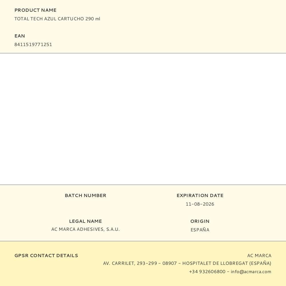 ADHESIVO SELLADOR AZUL TOTAL TECH, 290 ml, PEGA, SELLA Y REPARA BAJO TODO TIPO DE CONDICIONES METEOROLÓGICAS, CON 370 % DE ELASTICIDAD. TIEMPO DE SECADO 1 h