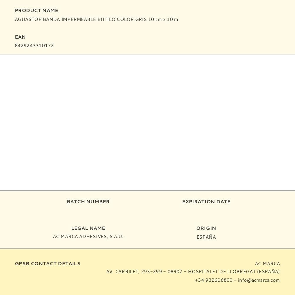 AGUASTOP BANDA IMP. BUTILO GRIS 10 cm x 10 m. PRODUCTOS PARA REPARACIONES DE EMERGENCIA Y DEFINITIVAS SOLUCIONES DE EFECTIVIDAD TOTAL APLICACIÓN SOBRE UNA GRAN VARIEDAD DE MATERIALES