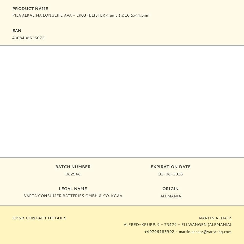 PILA ALKALINA VARTA AAA - LR03 LONGLIFE (BLISTER 4 unid.) Ø10,5x44,5mm (diámetro/alto)