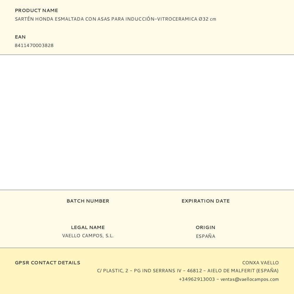 SARTÉN HONDA ESMALTADA CON ASAS PARA INDUCCIÓN-VITROCERAMICA Ø32cm. VAELLO. APTA PARA FUEGOS DE LLAMA, ELÉCTRICO, VITROCERÁMICA, INDUCCIÓN Y HORNO.