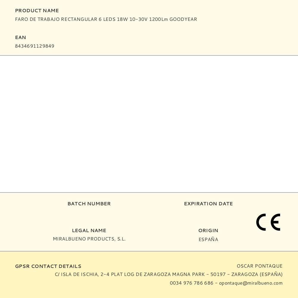 FARO DE TRABAJO RECTANGULAR 6 LED - FLUJO LUMINOSO 1200 lm - POTENCIA 18W, TENSIÓN DE FUNCIONAMIENTO 10 - 30V. DIMENSIONES - 11 x 5,5 x 6,1 cm