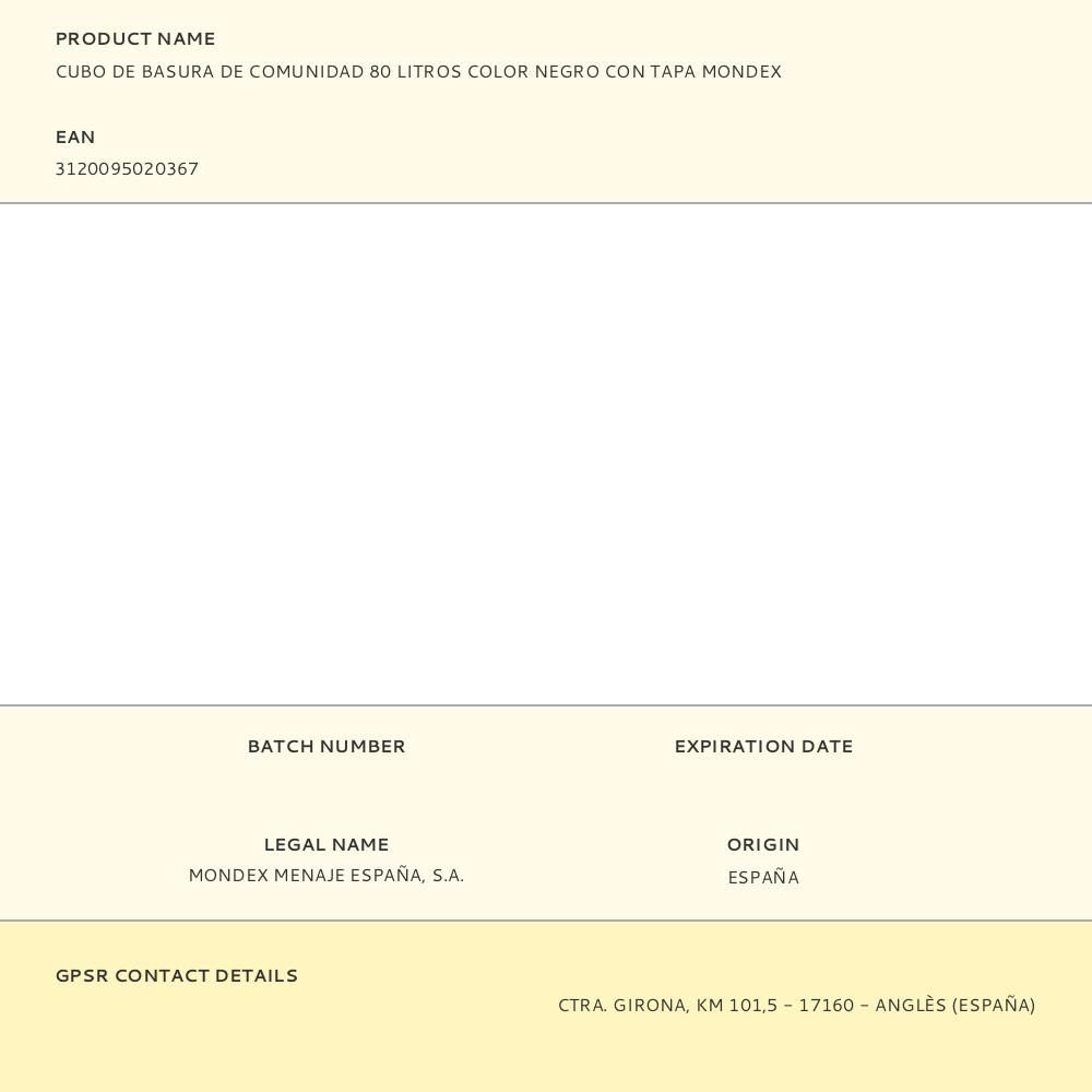 CUBO DE BASURA DE COMUNIDAD 80 LITROS. COLOR: NEGRO. TAMAÑO: Ø49,5x55,5cm (diámetro/alto) MATERIAL: POLIPROPILENO. MONDEX.