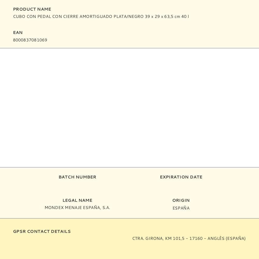 CUBO CON PEDAL DE APERTURA 40 LITROS CON CIERRE AMORTIGUADO TAMAÑO: 39x29x63,5cm (ancho/fondo/alto) COLOR PLATA/NEGRO. MATERIAL: POLIPROPILENO