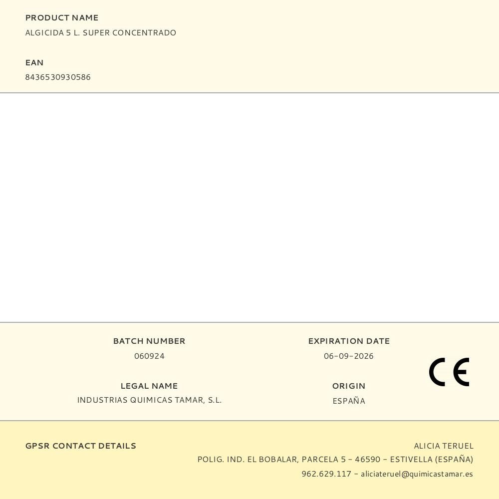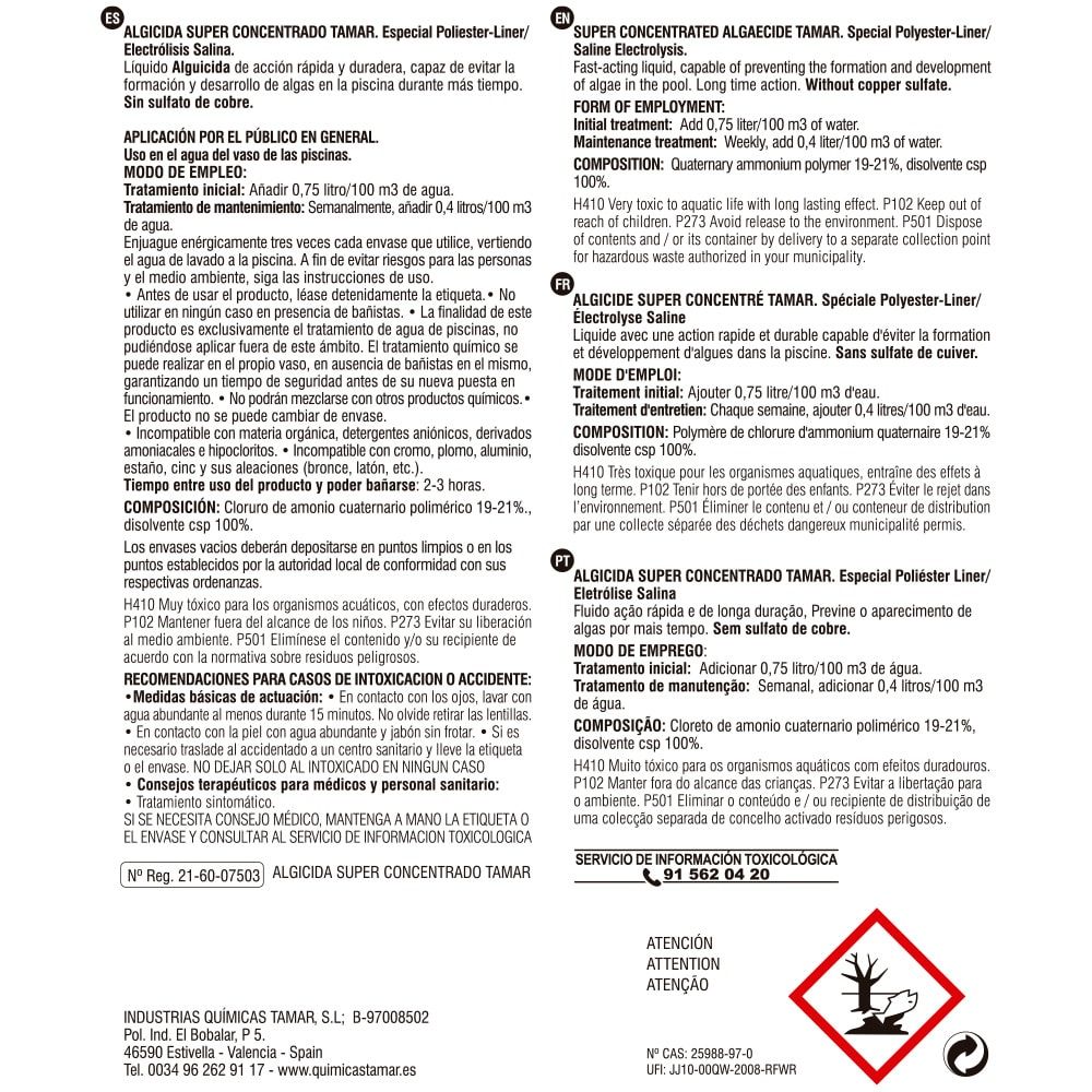 ALGICIDA CONCENTRADO, GARRAFA 5 L. ESPECIAL PARA PISCINA ELECTRÓLISIS SALINA Y POLIESTER, LINER. LIQUIDO DE ACCION RAPIDA Y DURADERA CAPAZ DE EVITAR LA FORMACION Y DESARROLLO DE ALGAS EN LA PISCINA DURANTE MAS TIEMPO. SIN SULFATO DE COBRE