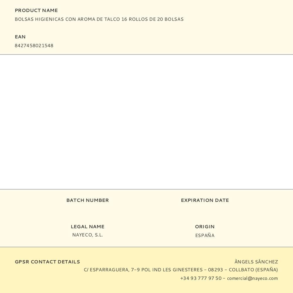 ROLLO DE 20 BOLSAS HIGIÉNICAS CON AROMA DE TALCO COLORES SURTIDOS 32 x 22 cm, 16 uds