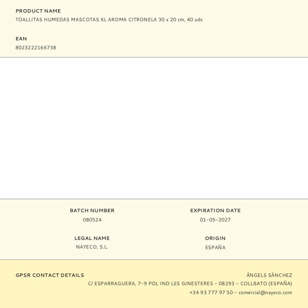 TOALLITAS HÚMEDAS MASCOTAS XL 30 x 20 cm, 40 uds, AROMA CITRONELA