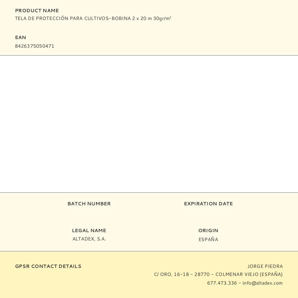 TELA DE PROTECCIÓN PARA CULTIVOS-BOBINA 2x20m. GRAMAJE: 30gr/m². TELA DE PROTECCIÓN PARA CULTIVOS Y PLANTAS, CON TRATAMIENTO U.V. PERMEABLE A LA LUZ, AIRE Y AGUA. EN FORMA DE PAÑO. PROTEGE DE LA LLUVIA, GRANIZO, PLAGAS, PAJAROS. FAVORECE EL CRECIMIENTO Y LA FLORACION. BIOTOP GARDEN