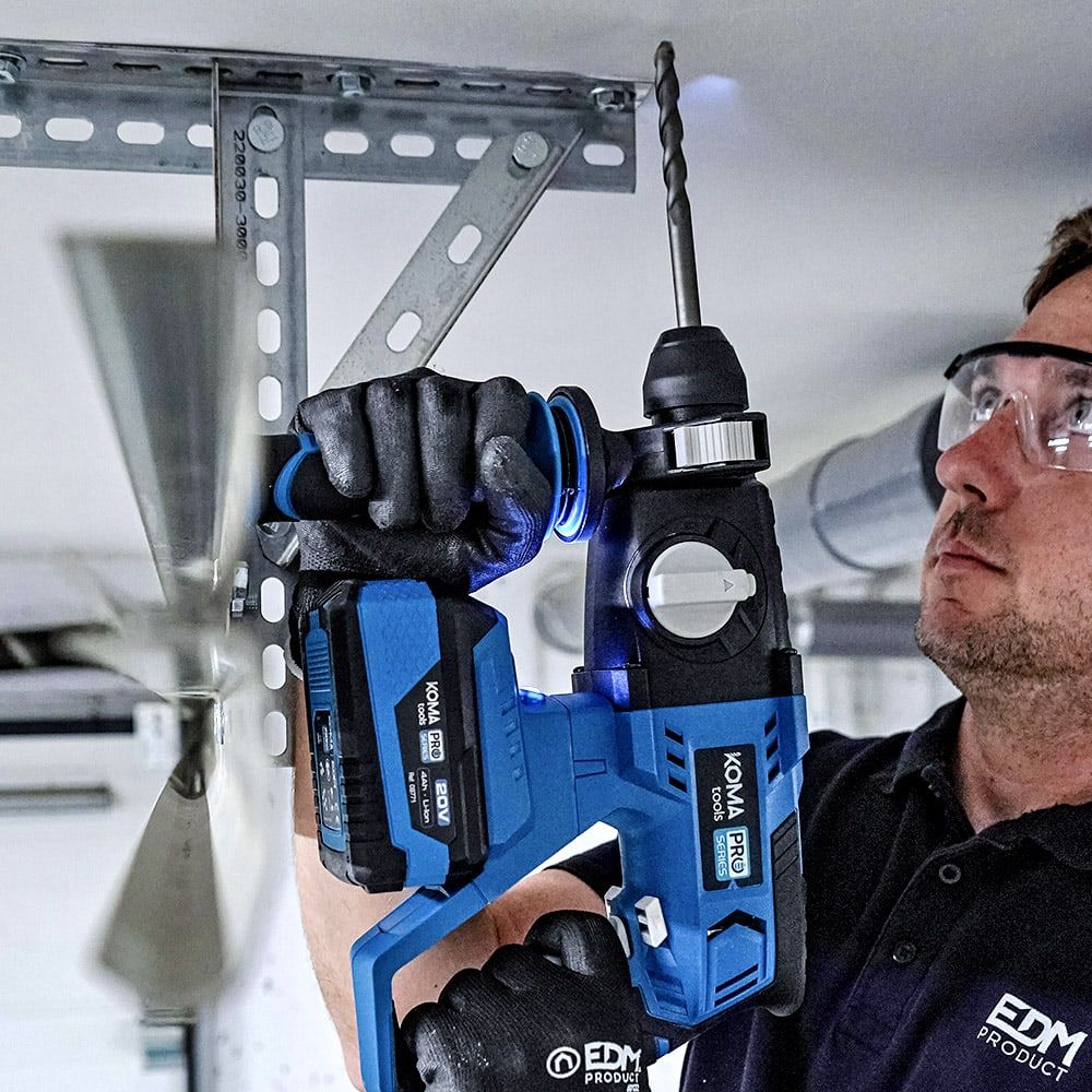 KIT MALETÍN MARTILLO PERCUTOR 20 V CON 1 BATERIA LI-ION 4.0A. Y CARGADOR 08772. VELOCIDAD VARIABLE DE 0-1.700rpm. FRECUENCIA DE IMPACTO: 0 A 5500t/min. FUERZA DE IMPACTO: 1,8J. 3 FUNCIONES (PERCUTOR + TALADRO + TALADRO/PERCUTOR). PORTABROCAS SDS+. CAPACIDAD DE PERFORACION MADERA 26mm, ACERO 13mm, HORMIGON 20mm. MANGO ADICIONAL CON VARILLA DE CONTROL DE PROFUNDIDAD. LUZ LED PARA ILUMINAR EL PUNTO DE TRABAJO. INCLUYE 3 BROCAS SDS DE 8, 10 Y 12mm. 30x19.5cm