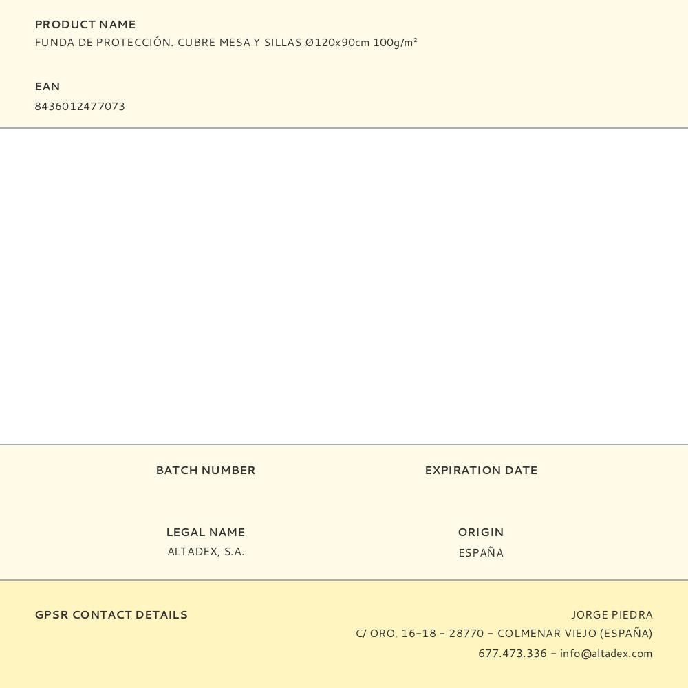 FUNDA DE PROTECCIÓN. CUBRE MESA Y SILLAS Ø120 x 90 cm. MATERIAL POLIETILENO 100 g/m². IMPERMEABLE. FORMA CIRCULAR. INCOPORA BOLSILLOS TRANSPIRABLES EN LOS LATERALES. OJALES QUE FACILITAN SU ATADO Y/O SUJECIÓN. INCLUYE CUERDA DE SUJECIÓN
