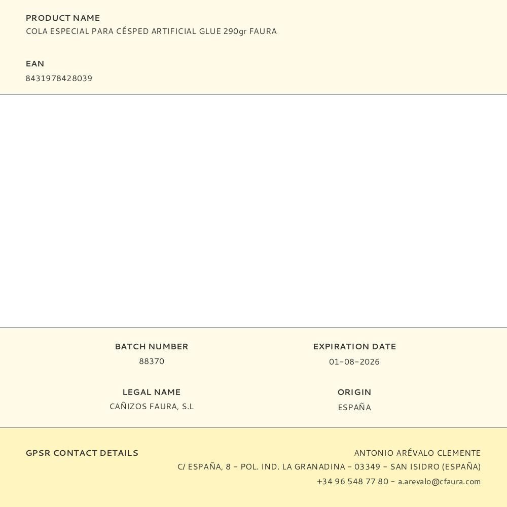 COLA ESPECIAL PARA CÉSPED ARTIFICIAL GLUE 290gr FAURA. APLICACIÓN CON PISTOLA, COLOR VERDE. ADHESIVO ESPECIAL PARA CÉSPED ARTIFICIAL. MUY BUENA ADHESIÓN Y SECADO ULTRA RÁPIDO. APTA PARA SUPERFICIES HÚMEDAS. GRAN RESISTENCIA A LOS RAYOS UV Y A LA INTEMPERIE. APLICABLE TANTO EN INTERIOR COMO EN EXTERIOR. TOTALMENTE EXENTO DE ISOCIANATOS, SILICONAS Y DISOLVENTES. APTO PARA LA ADHESIÓN SOBRE LA GRAN MAYORÍA DE MATERIALES DE CONSTRUCCIÓN: HORMIGÓN, LADRILLO, CERÁMICA. SIN OLORES MOLESTOS. NO REQUIERE USO DE GUANTES.