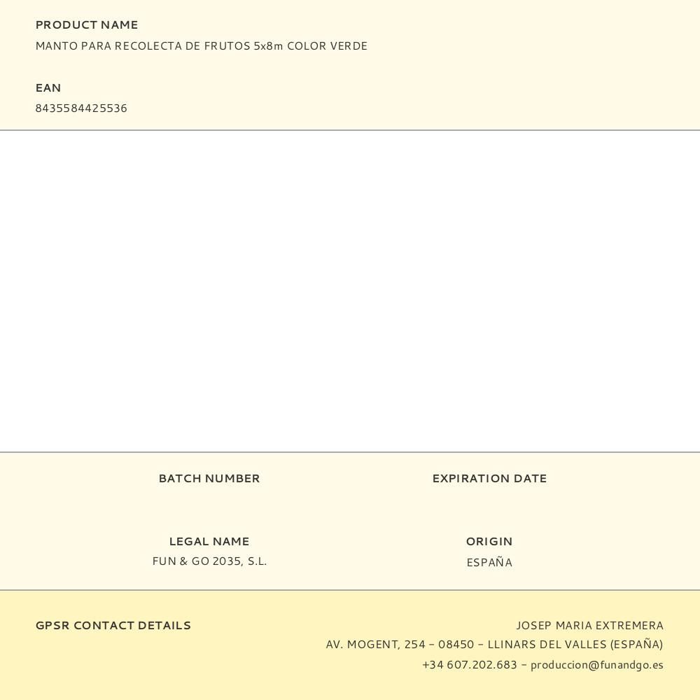 MANTO PARA RECOLECTA DE FRUTOS 5x8m (ancho/fondo) COLOR VERDE. MATERIAL: POLIPROPILENO