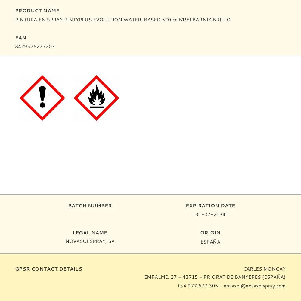 SPRAY BARNIZ EVOLUTION WATER-BASED 520 cc BRILLO B199 HA SIDO ESPECIALMENTE CONCEBIDA PARA USUARIOS QUE BUSCAN UNA PINTURA EN SPRAY MÁS RESPETUOSA CON EL MEDIOAMBIENTE. SE TRATA DE UN PRODUCTO CON FACILIDAD Y COMODIDAD DE USO. NO HUELE YA QUE NO USA DISOLVENTES AGRESIVOS Y PERMITE LOGRAR UN ACABADO LISO Y UNIFORME. TIENE UNA GRAN ADHERENCIA Y RESISTENCIA AL PASO DEL TIEMPO Y A LAS INCLEMENCIAS CLIMATOLÓGICAS. ES UNA PINTURA EN SPRAY DE COLORES SÓLIDOS RAL BRILLANTES APTA PARA PINTAR CUALQUIER MATERIAL INCLUIDOS AQUELLOS MÁS DELICADOS.