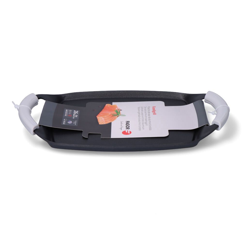 PLANCHA PARRILLA FUNDIGRILL ALUMINIO 26cm. TAMAÑO SUPERFICIE COCCIÓN 26x20cm (ancho/fondo). CON ASAS DE SILICONA EXTRAIBLES Y TERMO AISLANTES. CONSTRUIDA EN UNA SOLA PIEZA, INDEFORMABLE. APTA PARA EL HORNO (SIN LAS ASAS DE SILICONA). APTA PARA TODO TIPO DE FUEGOS. APTO PARA LAVAVAJILLAS, FABRICADO CON TEFLON DUPONT. FAGOR