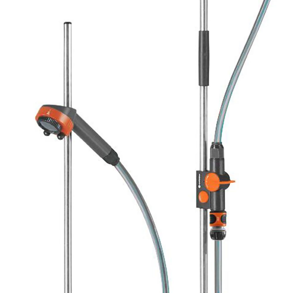 DUCHA DE JARDÍN TRIO SOBRE TRÍPODE GARDENA. MEDIDA: 220cm (alto). CHORRO LARGO Y DULCE O CHORRO NEBULIZANTE CON AJUSTE STOP. LA ALCACHOFA DE LA DUCHA, FLEXIBLE Y EXTRAÍBLE, ESTÁ CONECTADA A UNA MANGUERA DE 1,3m DE LARGO Y DA MÁS LIBERTAD PARA DUCHARSE.
