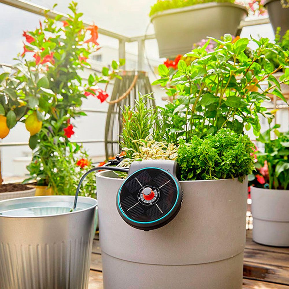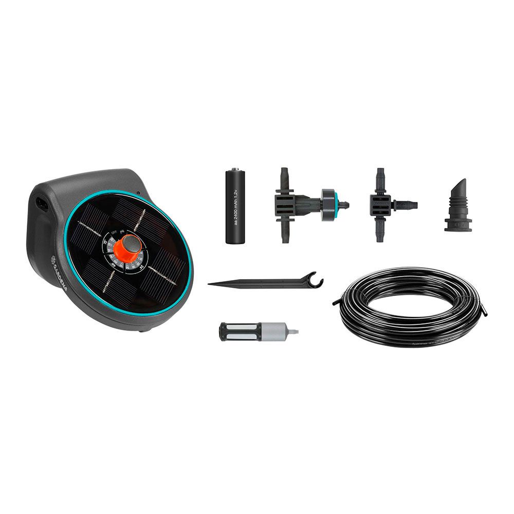 SET DE RIEGO POR GOTEO AQUABLOOM CON TODO LO NECESARIO PARA UN RIEGO EN TERRAZA O BALCÓN SI NECESIDAD DE LUZ O UN GRIFO. EL KIT INCLUYE: 1 UNIDAD CENTRAL, 20 GOTEROS DE 0,5l/h, 20 ESTACAS, 3 BATERIAS AA, 5 CONEXIONES EN T DE 4mm, 5 EMPALMES DE 4mm, 1 FILTRO Y 20 m DE TUBERIA DE 4 mm