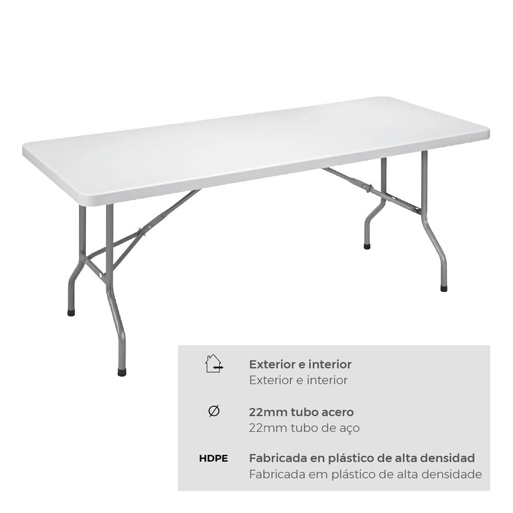 MESA PLEGABLE DIMENSIONES MONTADA: 180 x 74 x 74 cm (ancho/fondo/alto) MEDIDA PLEGADA: 95 x 35 x 9 cm (ancho/fondo/alto). TUBO Ø22 x 1.0mm. USO EXTERIOR E INTERIOR, ACERO, FABRICADO EN PLÁSTICO DE ALTA DENSIDAD. NO APTA PARA USO PROFESIONAL