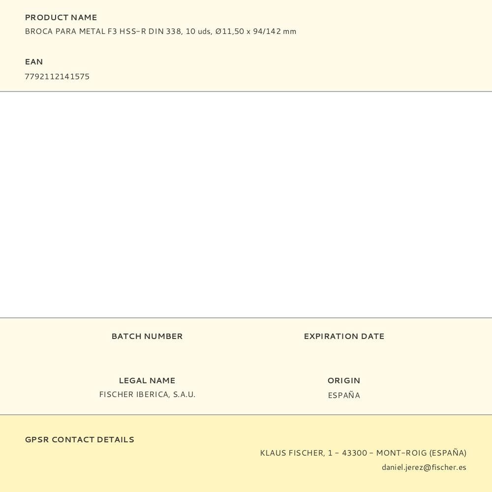 BROCA PARA METAL F3 HSS-R DIN 338, 10 uds, Ø11,50 x 94/142 mm