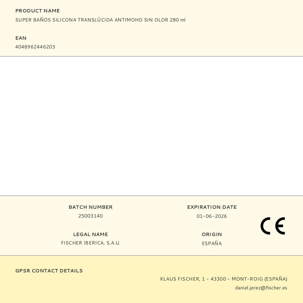 SUPER BAÑOS SILICONA TRANSLÚCIDA ANTIMOHO SIN OLOR 280 ml DE LARGA DURACIÓN, RÁPIDA CURACIÓN. CON 15 AÑOS DE GARANTÍA SIN ENNEGRECIMIENTO POR MOHO APLICAR CON PISTOLA DE SILICONA - PARA ASEGURAR EL PEGADO DEBE ALISARSE LA SILICONA ANTIMOHO, ASEGURANDO UN CONTACTO TOTAL ENTRE ÉSTA Y LAS SUPERFICIES A SELLAR, ANTES DE LA FORMACIÓN DE UNA PIEL SUPERFICIAL. APLICACIONES: SELLADO INTEGRAL DE BAÑOS Y COCINAS EN ACRISTALAMIENTO DE MARCOS DE VENTANAS, BAÑOS, LAVABOS, DUCHAS, MAMPARAS, ESPEJOS, SANITARIOS, JUNTAS EXPUESTAS A HUMEDAD, PARA HORMIGÓN, MADERA, METALES, MÁRMOL, GRANITO, ARENISCA. TRATAMIENTO ANTIMOHO QUE GARANTIZA 15 AÑOS SI SE APLICA BAJO CONDICIONES ESPECIFICADAS - FORMA PIEL EN 15 MINUTOS LO QUE PERMITE UTILIZAR EL ELEMENTO SELLADO RÁPIDAMENTE - SILICONA NEUTRA PARA TODOS LOS MATE...