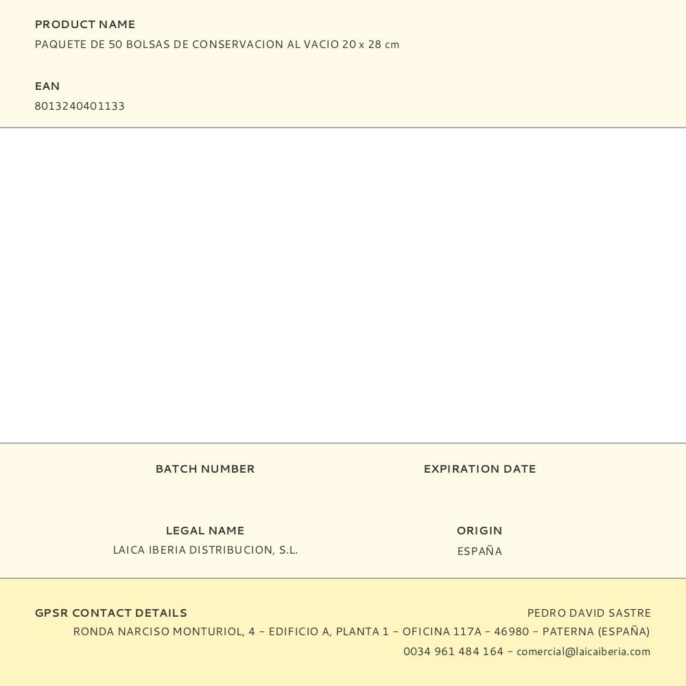 PAQUETE DE 50 BOLSAS 20x28cm VT3504 LAICA. ALIMENTOS FRESCOS HASTA 5 VECES MÁS TIEMPO. EVITAN EL DAÑO POR CONGELACIÓN. NO MÁS OLORES EN LA NEVERA. REDUCE EL DESPEDICIO DE COMIDA. ESPECIFICO PARA ALIMENTOS. NO CONTIENE BISFENOL A. ADECUADO PARA USAR EN LA NEVERA Y EL CONGELADOR. ADECUADO PARA COCINAR EN AGUA (80°C) Y HERVIR (100°C MÁXIMO 15 MINUTOS) . ADECUADO PARA COCINAR A "BAJA TEMPERATURA" HASTA 70°C DURANTE 6 HORAS.