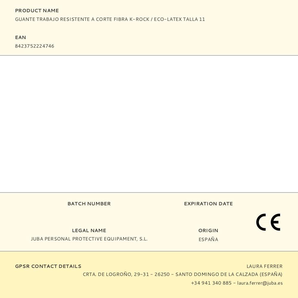 GUANTE TRABAJO RESISTENTE A CORTE FIBRA K-ROCK / ECO - LATEX T-11. APORTA TACTO, LIGEREZA, FLEXIBILIDAD Y CONFORT. EXCELENTE AGARRE EN SITUACIONES SECAS Y HÚMEDAS GRACIAS A SU DISEÑO EN PALMA DE MICROVENTOSAS. RECUBRIMIENTO DE LÁTEX ECOLÓGICO YA QUE NO SE UTILIZAN ADITIVOS NI PRODUCTOS QUÍMICOS EN SU PROCESO DE FABRICACIÓN. RESISTENCIA A LA ABRASIÓN, MAYOR DURABILIDAD. USOS: MANIPULACIONES DE OBJETOS CON RIESGO DE CORTE MEDIO/ALTO, TANTO EN MEDIO SECO COMO EN SUPERFICIES HÚMEDAS O MOJADAS, TRABAJOS DE CONSTRUCCIÓN, CANTERAS, MANIPULACIÓN DE PRODUCTOS CERÁMICOS, PIZARRA. INSTALACIONES DE FONTANERÍA