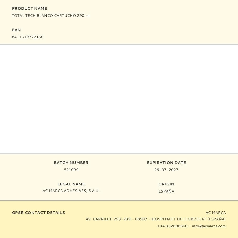 ADHESIVO SELLADOR BLANCO TOTAL TECH, 290 ml, PEGA, SELLA Y REPARA BAJO TODO TIPO DE CONDICIONES METEOROLÓGICAS, CON 370 % DE ELASTICIDAD. TIEMPO DE SECADO 1 h
