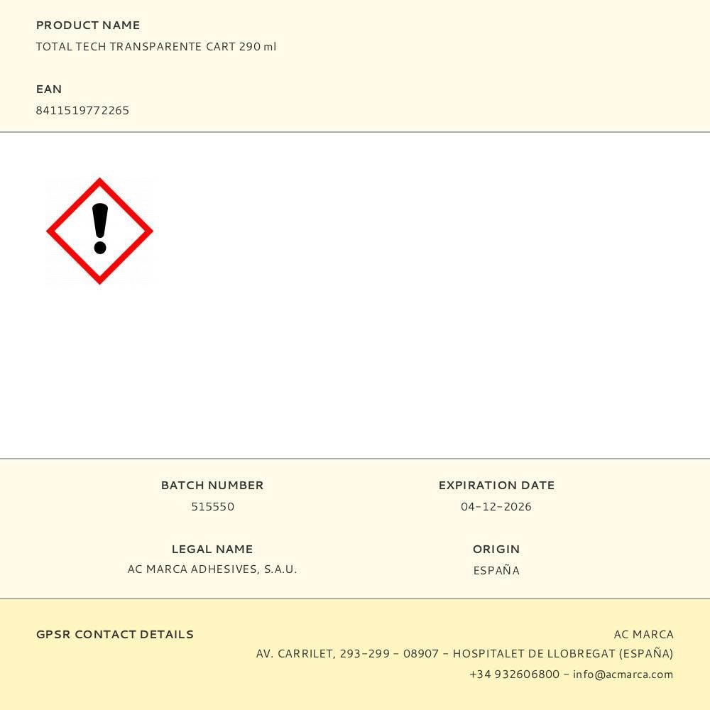 ADHESIVO SELLADOR TRANSPARENT TOTAL TECH, 290 ml, PEGA, SELLA Y REPARA BAJO TODO TIPO DE CONDICIONES METEOROLÓGICAS, CON 370 % DE ELASTICIDAD. TIEMPO DE SECADO 1 h