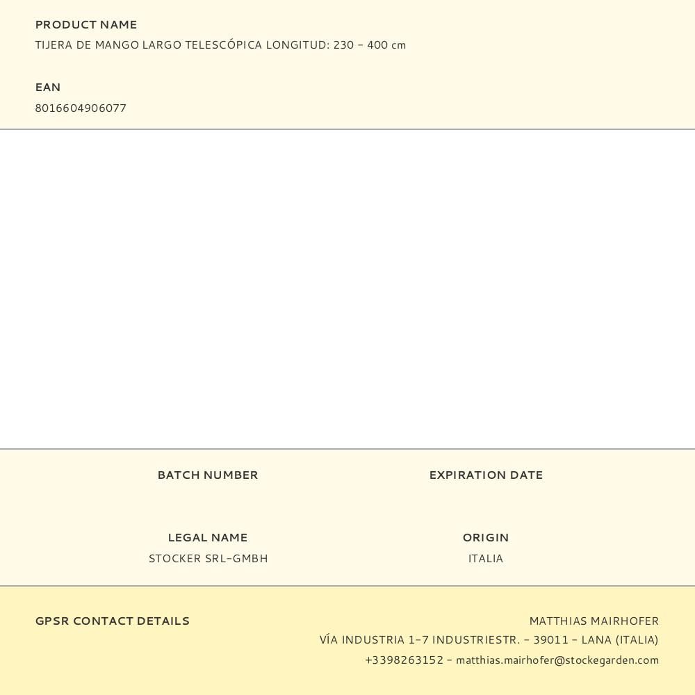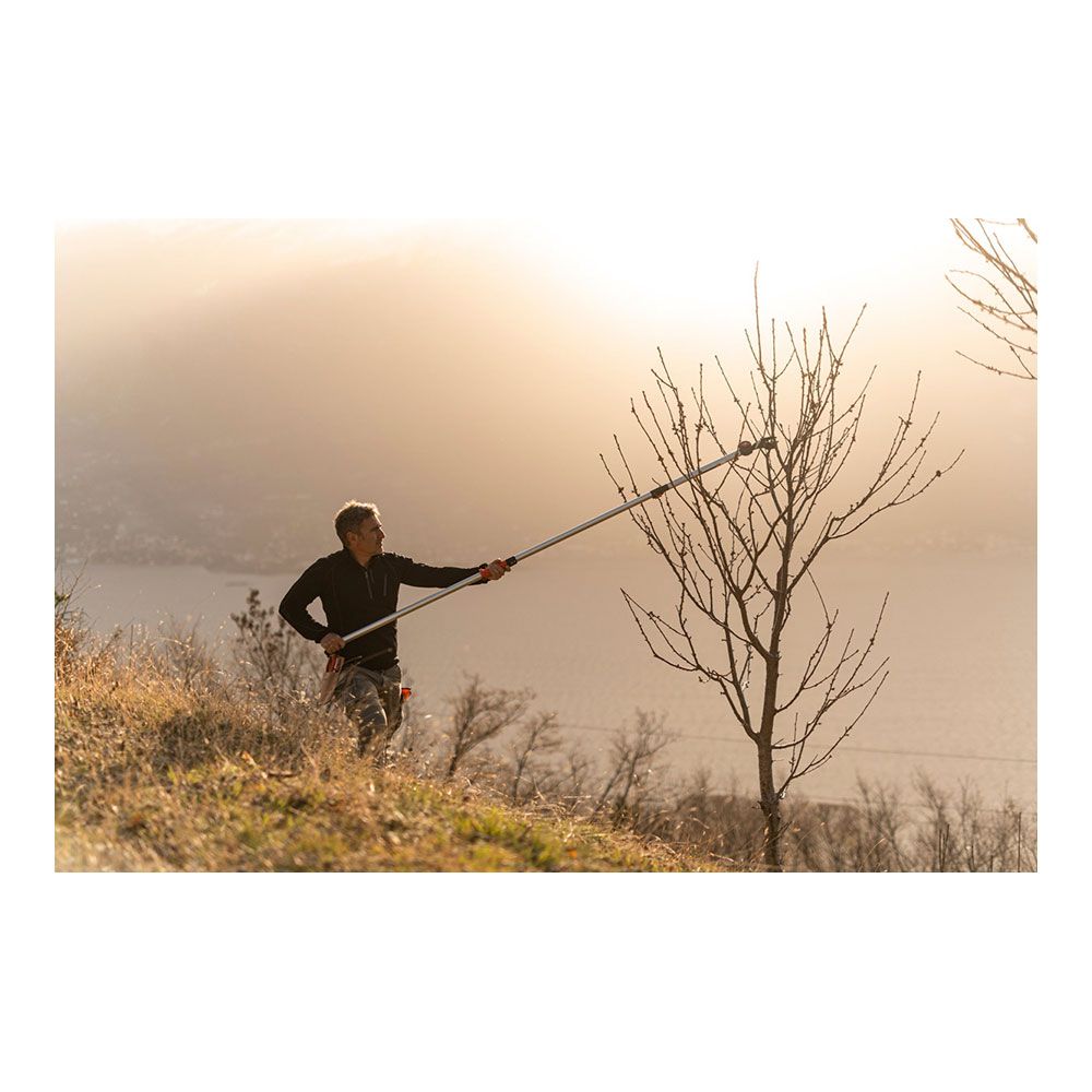 TIJERA DE MANGO LARGO TELESCÓPICA 230 - 400cm. STOCKER. ¡ADIÓS FATIGA! LA TIJERA CON MANGO TELESCÓPICO ES PERFECTA PARA PODAR ÁRBOLES DE GRANDES DIMENSIONES COMO EL OLIVO. PERMITE PODAR TAMBIÉN LAS RAMAS EN 5-6 METROS DE ALTURA CON DIÁMETRO DE 35mm. GRACIAS AL MANGO EXTENSIBLE, LA PODA PUEDE SER HECHA EN TODA SEGURIDAD DESDE EL SUELO, SIN ESCALERA. LA CABEZA DE CORTE AJUSTABLE A 180° Y QUE SE PUEDE BLOQUEAR EN CUALQUIER PUNTO OFRECE LA MÁXIMA FLEXIBILIDAD. CABEZA DE CORTE AJUSTABLE A 180° MANGO FÁCILMENTE PROLONGABLE. CIERRE SEGURO DE LA HOJA. LONGITUD: 230-400cm. PESO: 1.650g