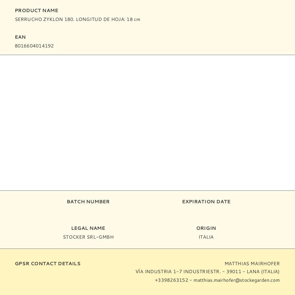 SERRUCHO ZYKLON 180. STOCKER. IDEAL PARA CUALQUIER TIPO DE PODA. EL MANGO DE GOMA OFRECE UNA TOMA FIRME, MIENTRAS LA LIJERA CURVA CREA EL ÁNGULO PARA DAR LA FUERZA ADECUADA DURANTE LA SIERRA, EVITANDO ESFUERZOS INNECESARIOS Y POSICIONES INCÓMODAS. LA HOJA DE ACERO TIENE LARGA DURACIÓN Y GRAN RESISTENCIA GRACIAS A LAS IMPULSOS TÉRMICOS. EMPUÑADURA ERGONÓMICA DE POLIPROPILENO. ANTIDESLIZANTE, CONFORTABLE POR SU BLANDA GOMA SINTÉTICA (MATERIAL TPA). HOJA DE ACERO TRATADA CON IMPULSOS TÉRMICOS. LONGITUD HOJA: 18cm PESO: 230g
