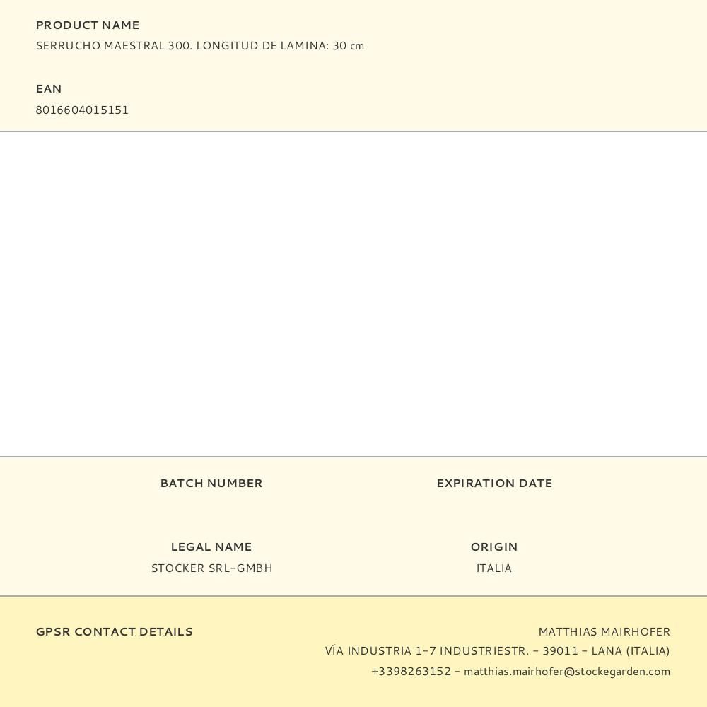 SERRUCHO MAESTRAL 300. STOCKER. SERRUCHO FIJO CON HOJA RECTA, IDEAL PARA CUALQUIER TIPO DE CORTE Y PODA, PARA AFICIONADOS DE JARDÍN. EL MANGO DE GOMA GARANTIZA UNA TOMA FIRME, MIENTRAS LA LIGERA CURVA CREA EL ÁNGULO PARA DAR LA FUERZA ADECUADA EN FASE DE SIERRA, EVITANDO ESFUERZOS INNECESARIOS Y POSICIONES INCÓMODAS. LA HOJA DE ACERO TRATADA CON IMPULSOS TÉRMICOS SIGNIFICA RESISTENCIA Y LARGA DURACIÓN. EMPUÑADURA ERGONÓMICA DE POLIPROPILENO. ANTIDESLIZANTE, CONFORTABLE POR SU BLANDA GOMA SINTÉTICA (MATERIAL TPA). HOJA DE ACERO TRATADA CON IMPULSOS TÉRMICOS. CON PRÁCTICO ESTUCHE. LONGITUD HOJA: 30cm PESO: 170g