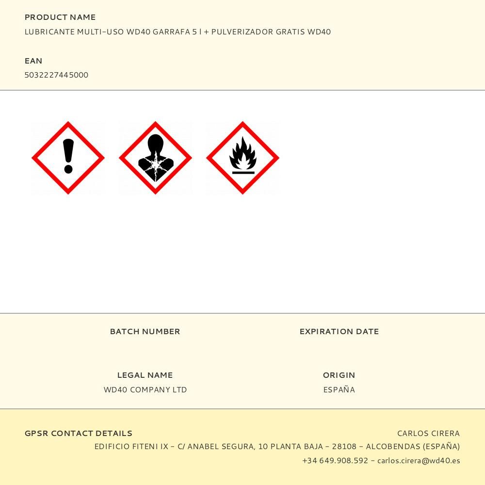 LUBRICANTE MULTI-USO WD40 GARRAFA 5 l + PULVERIZADOR GRATIS WD40