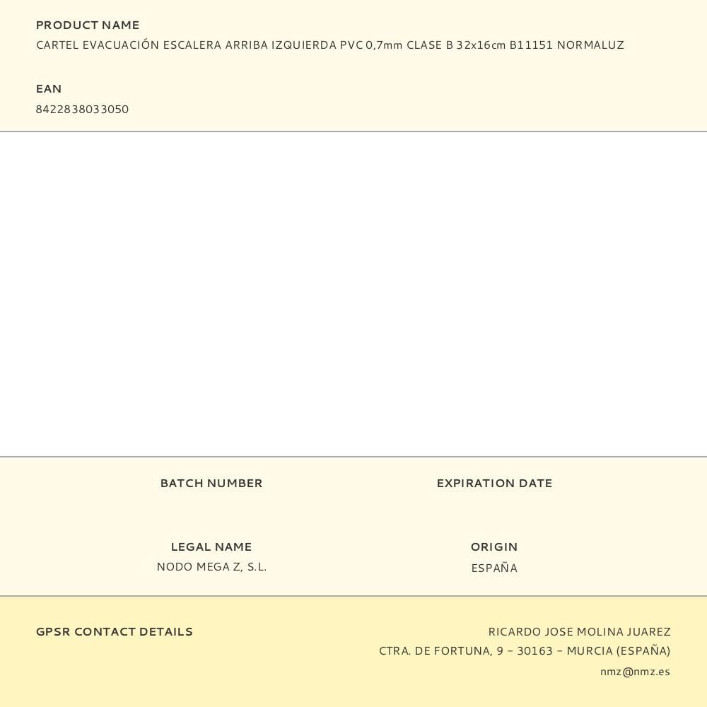 CARTEL EVACUACIÓN ESCALERA ARRIBA IZQUIERDA PVC 0,7mm CLASE B 32x16cm B11151 NORMALUZ