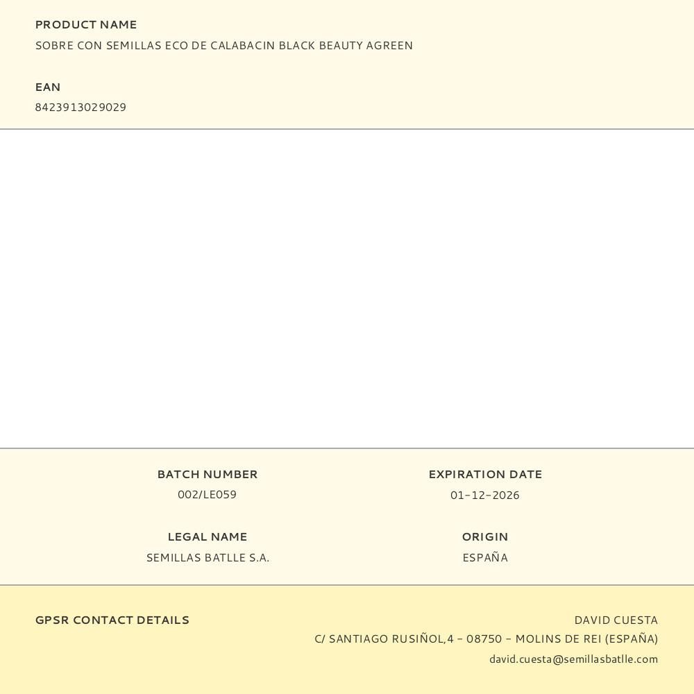 SOBRE CON SEMILLAS ECO DE CALABACIN BLACK BEAUTY AGREEN. MATA SIN RAMIFICACIONES, MUY PRECOZ, FRUTOS FINOS, ALARGADOS, DE EXTREMOS ROMOS Y COLORACIÓN VERDE. PLANTA SUMAMENTE PRODUCTIVA. CARNE SABROSA Y DELICADA