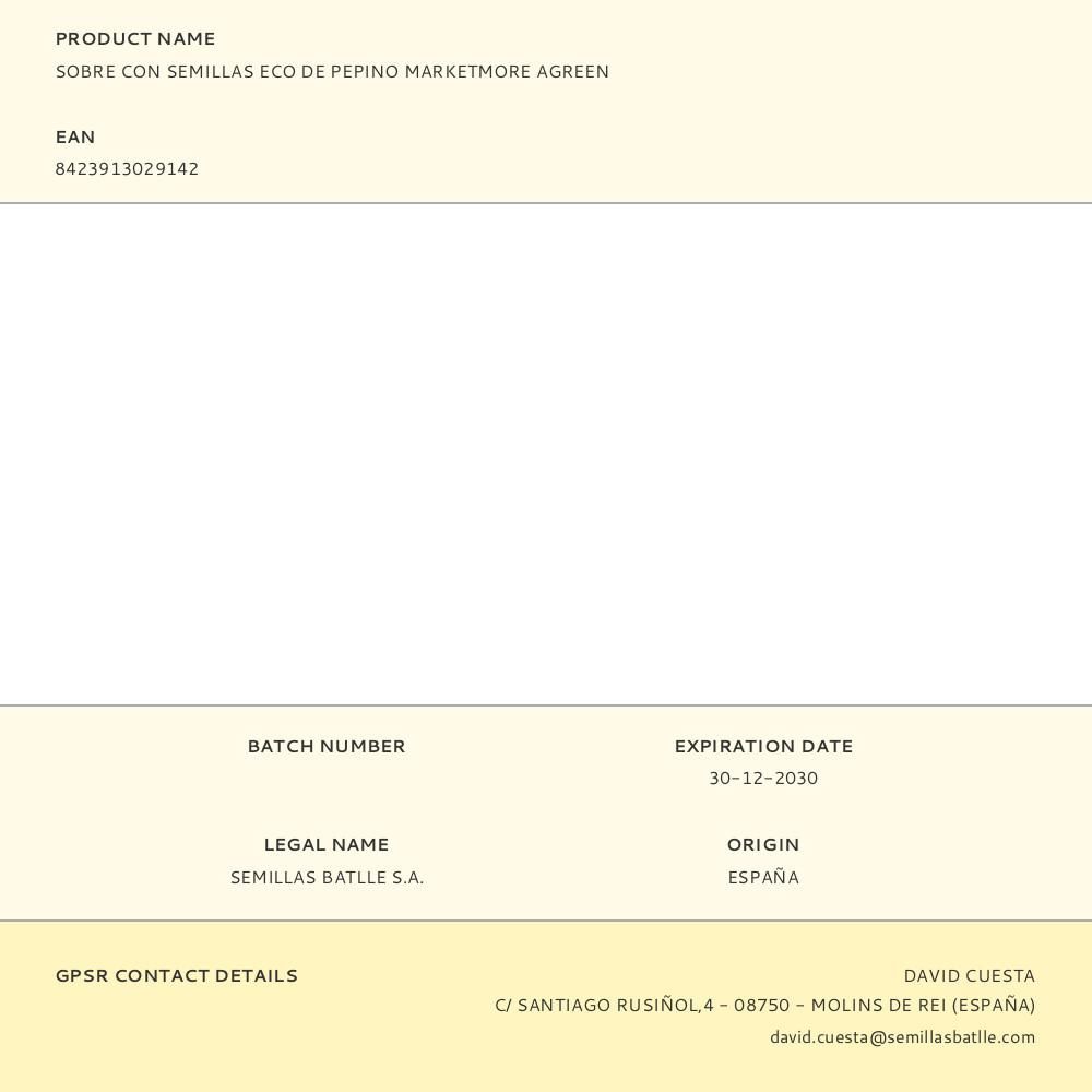 SOBRE CON SEMILLAS ECO DE PEPINO MARKETMORE AGREEN. FRUTOS DE TAMAÑO MEDIO DE UNOS 15 A 20 cm, EXCENTOS DE PINCHOS, CARNE BLANCA, COMPACTA Y DE EXQUISITO SABOR. MUY PRODUCTIVA DE DE GRAN ACEPTACIÓN EN LOS MERCADOS.