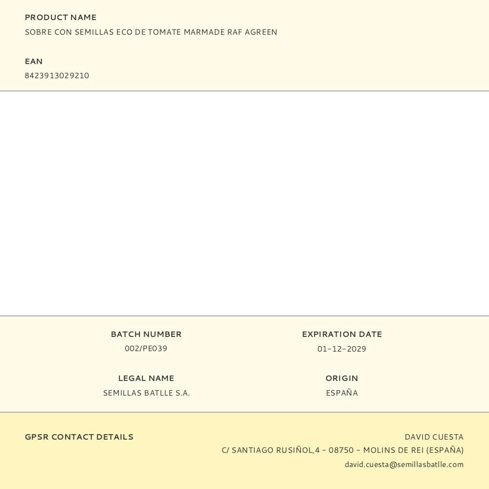 SOBRE CON SEMILLAS ECO DE TOMATE MARMADE RAF AGREEN