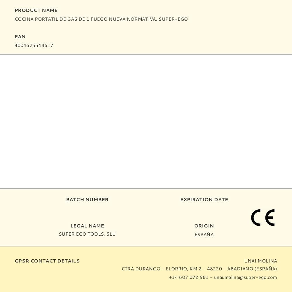 COCINA PORTATIL DE GAS DE 1 FUEGO NUEVA NORMATIVA. SUPER-EGO. COCINA A GAS COMPACTA Y PORTÁTIL, IDEAL PARA COCINAR ALIMENTOS AL AIRE LIBRE. EQUIPADA CON VÁLVULA DE DOBLE SEGURIDAD. CONFORME A LA NORMA EN-17476. TIPO DE GAS: CARTUCHOS DE GAS BUTANO SEGO BTN250 SEGÚN NORMATIVA EN417 (NO INCLUIDOS). CONSUMO NOMINAL: 160 G/h. POTENCIA: 2.200W. DIMENSIONES: 36x32x12cm. PESO NETO: 1,5kg. MEDIDAS Y PESO DEL EMBALAJE 36x32x12cm. 2kg. APTA PARA SARTENES Y OLLAS DE HASTA Ø26cm. ESTRUCTURA RESISTENTE FABRICADA EN ACERO INOX. REGULADOR DE LLAMA CON ENCENDIDO PIEZOELÉCTRICO. PANTALLA DE PROTECCIÓN CONTRA EL VIENTO. BANDEJA DE GOTEO. QUEMADOR EFICIENTE: ALTO RENDIMIENTO Y BAJO CONSUMO. AUTONOMÍA APROX. CARTUCHO GAS: 1,15h. PARA USO EN EXTERIORES O ZONAS INTERIORES ÚNICAMENTE BIEN VENTILADAS. NO ESTÁ ...