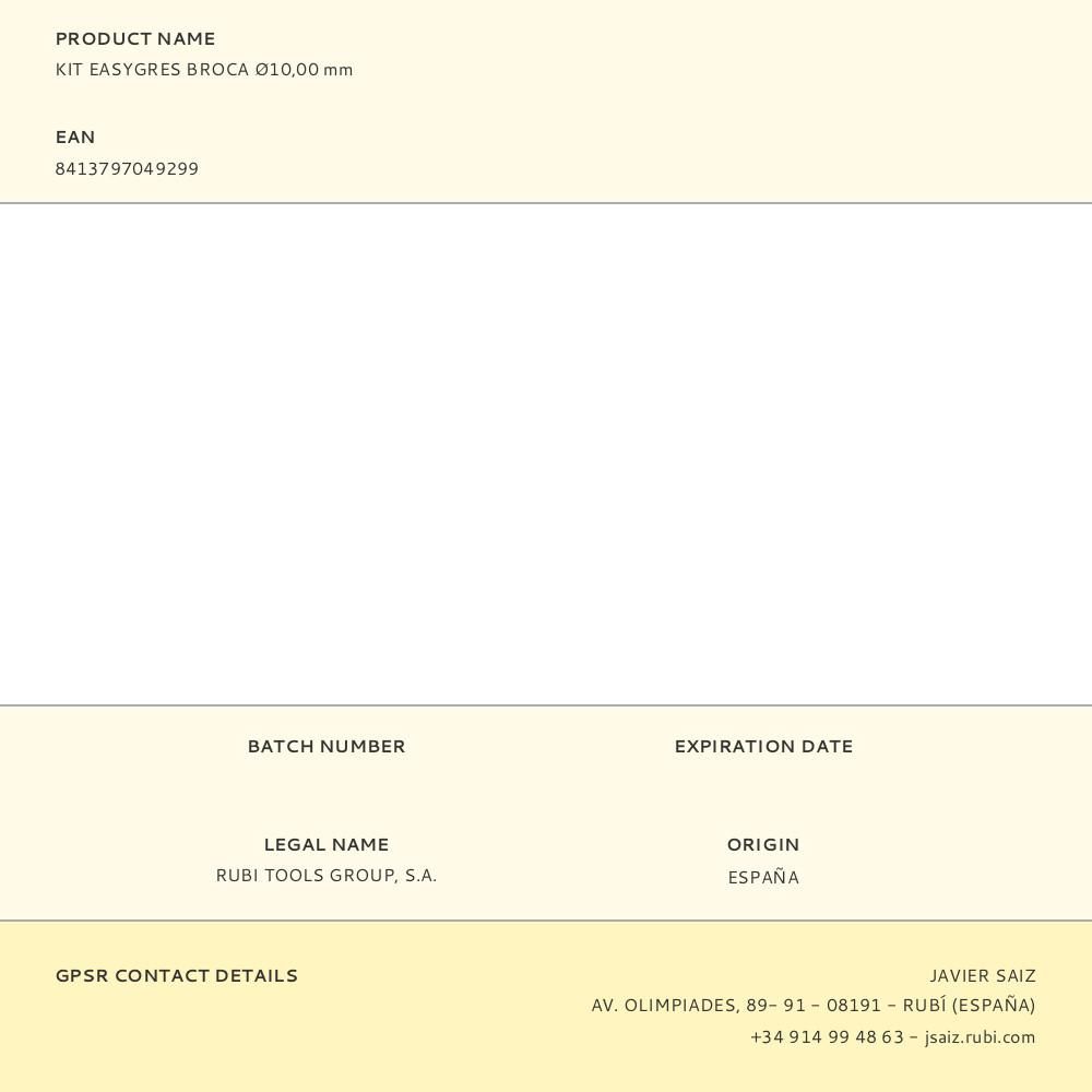 KIT EASYGRES BROCA Ø10,00 mm. SOLUCIÓN MÁS ECONÓMICA PARA AQUELLOS USUARIOS QUE NECESITAN REALIZAR PERFORACIONES DE DISTINTOS DIÁMETROS EN TODO TIPO DE BALDOSA CERÁMICA. SON BROCAS DE DIAMANTE ELECTRODEPOSITADO, DE CORTE HÚMEDO, APTAS PARA UTILIZAR CON TALADRO ELÉCTRICO SIN PERCUTOR. PERMITE LA PERFORACIÓN DE GRES, GRES PORCELÁNICO, GRANITO, MÁRMOL Y VIDRIO. COMPUESTO POR UNA BROCA DE 10 mm, UNA GUÍA EASYGRES CON CASQUILLO CENTRADOR Y LOS ADHESIVOS DE FIJACIÓN. PERMITE REALIZAR AGUJEROS TANTO EN SUELO COMO EN PARED, GRACIAS AL FUNCIONAL DISEÑO DE SU DEPÓSITO DE AGUA QUE INCORPORA UN GRIFO REGULADOR DE CAUDAL. LA GUÍA SE ADHIERE FÁCILMENTE A CUALQUIER SUPERFICIE, GRACIAS A SU SISTEMA DE ADHESIVOS RENOVABLES. LA VIDA MEDIA ES DE 10 AGUJEROS Y DEPENDE SIEMPRE DEL TIPO DE MATERIAL, DE SU ES...