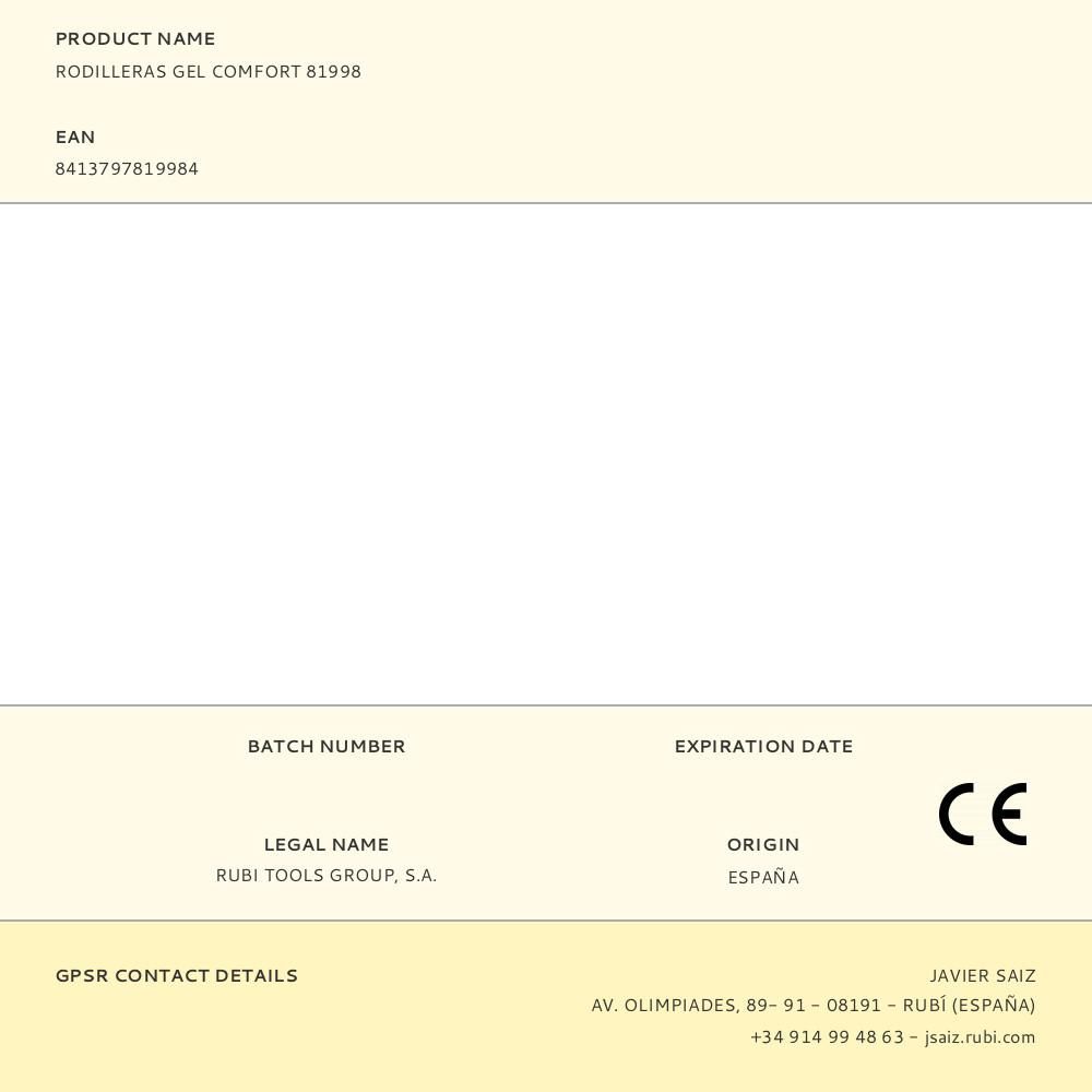 RODILLERAS GEL COMFORT 81998. DISEÑO ERGONÓMICO Y LA ELEVADA COMODIDAD DE UTILIZACIÓN. COMBINA EL USO DE MATERIALES DUROS Y RESISTENTES CONTRA GOLPES E IRREGULARIDADES DEL SUELO, Y MATERIALES BLANDOS EN SU INTERIOR, ADAPTABLES A LA ANATOMÍA PROPIA DE CADA USUARIO. SE ADAPTA A LAS IRREGULARIDADES DEL SOPORTE DE COLOCACIÓN, ABSORBIENDO LAS INCOMODIDADES QUE ESTÁN PUEDAN GENERAR Y ADAPTÁNDOSE A LOS MOVIMIENTOS DE LA FORMA MÁS NATURAL POSIBLE. INCORPORAN GEL DE SILICONA EN SU INTERIOR QUE, PARA DARLES UNA GRAN ESTABILIDAD, EVITANDO LA SOBRECARGA DE LIGAMENTOS Y TENDONES. INCORPORAN DOS BANDAS EXTRA-ANCHAS FABRICADAS EN NEOPRENO, QUE APORTAN UNA ELEVADA FIJACIÓN, SEGURA Y CONFORTABLE Y UN SISTEMA DE CIERRE RÁPIDO QUE FACILITA SU COLOCACIÓN.