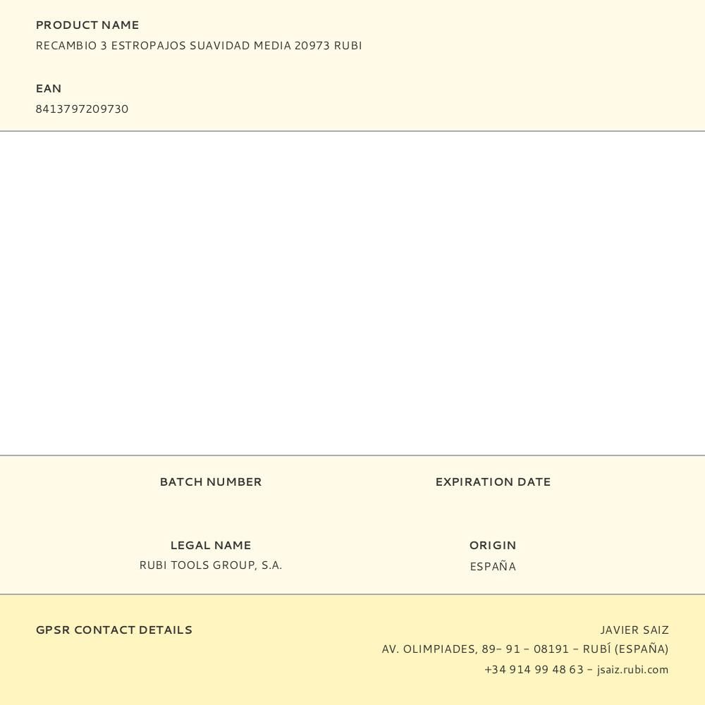 RECAMBIO 3 ESTROPAJOS SUAVIDAD MEDIA 20973 RUBI. RECAMBIO DE 3 ESTROPAJOS PARA UTILIZAR COMO RECAMBIO DE LA TALOCHA REF. 20900. IDEAL PARA LA LIMPIEZA GENERAL Y MANTENIMIENTO DE BALDOSAS CERÁMICAS ESMALTADAS. COLOR AZUL