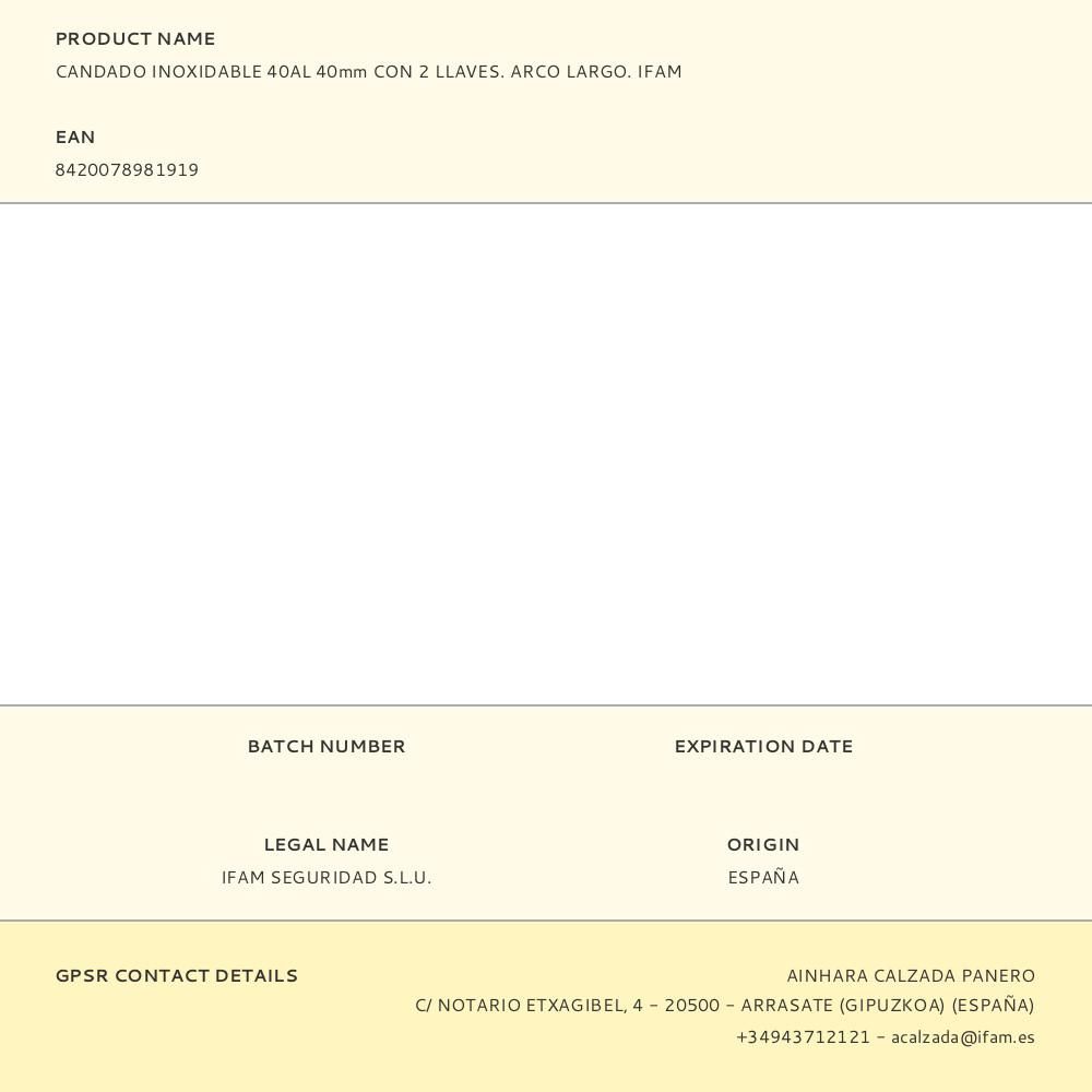 CANDADO INOXIDABLE 40AL 40mm CON 2 LLAVES. ARCO LARGO. IFAM